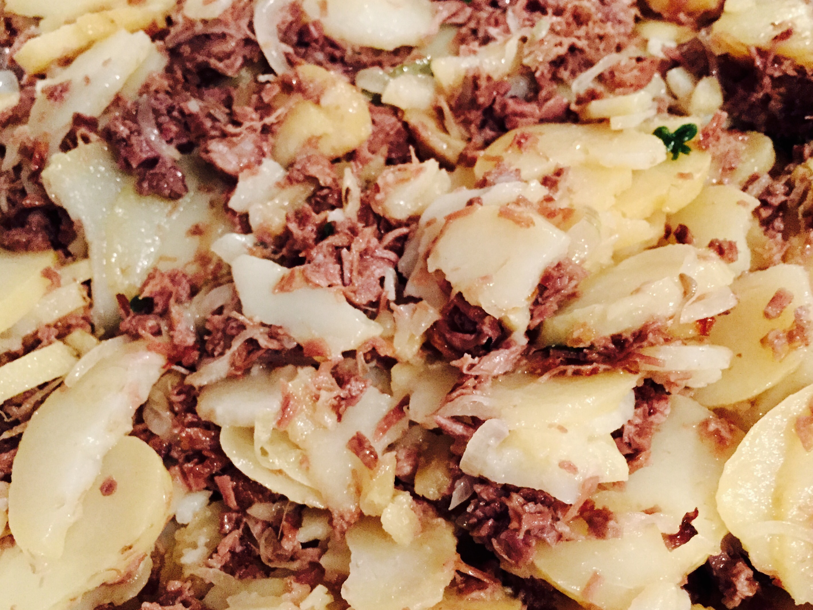 Das Bauerngröstl ist ein traditionelles südtiroler Bauerngericht, welches sich hervorragend dazu eignet Suppenfleisch oder übrig gebliebenen Pellkartoffeln zu verwerten.