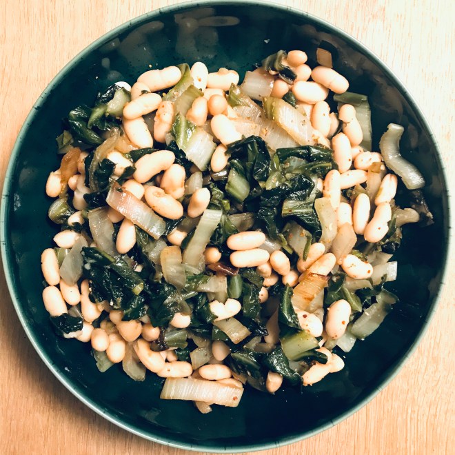 Den Mangold waschen und klein schneiden, mit Olivenöl und etwas Salz bissfest garen. Die letzen 5 Minuten die abgeseihten Cannellini dazugeben und mitgaren.
