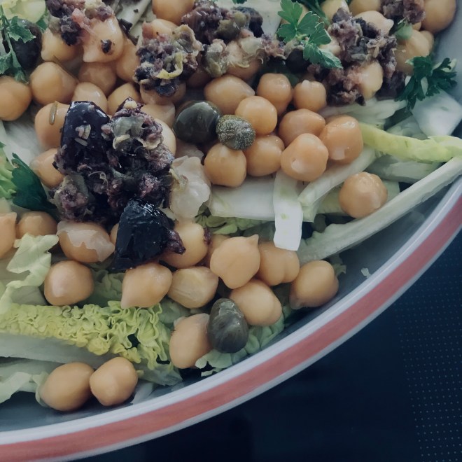 3-4 Esslöffel Olivenöl mit den Anchoviefilets mixen. Die Oliven und Kapern klein schneiden und zu dem Olivenöl geben. Die Olivenölmixtur über den Salat geben und mit Bottargahobel bestreuen.