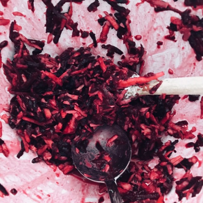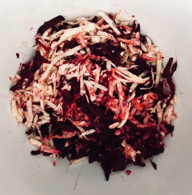 Die rohen rote Beete Knollen schälen und grob raspeln, ebenso mit der Pastinake verfahren. Ich benutze dafür die grobe Raffel der Käsereibe.