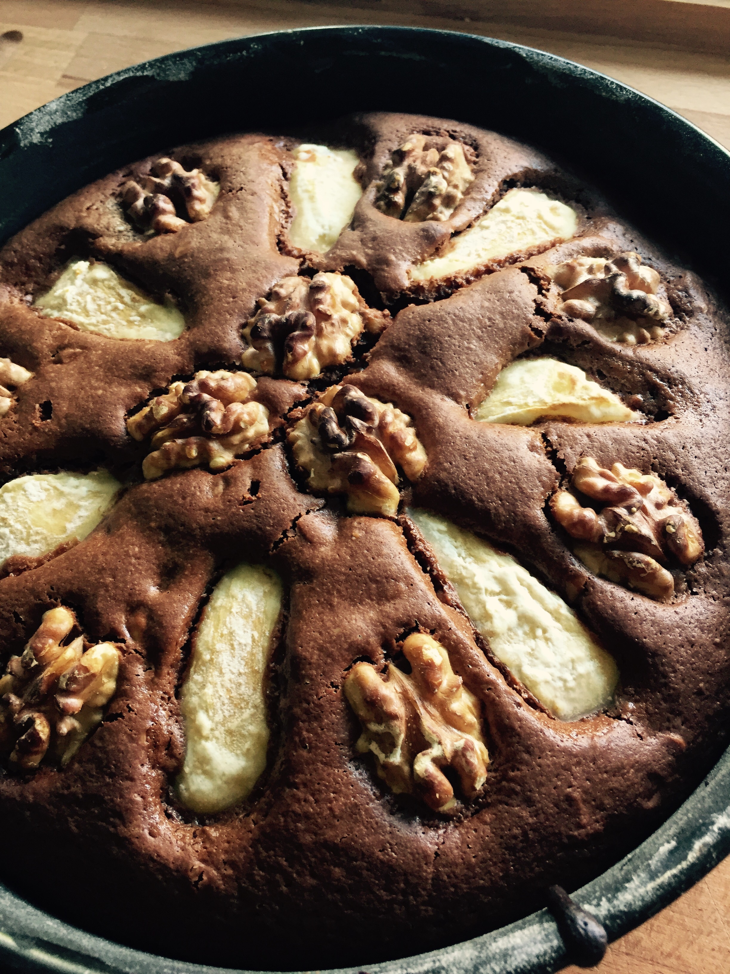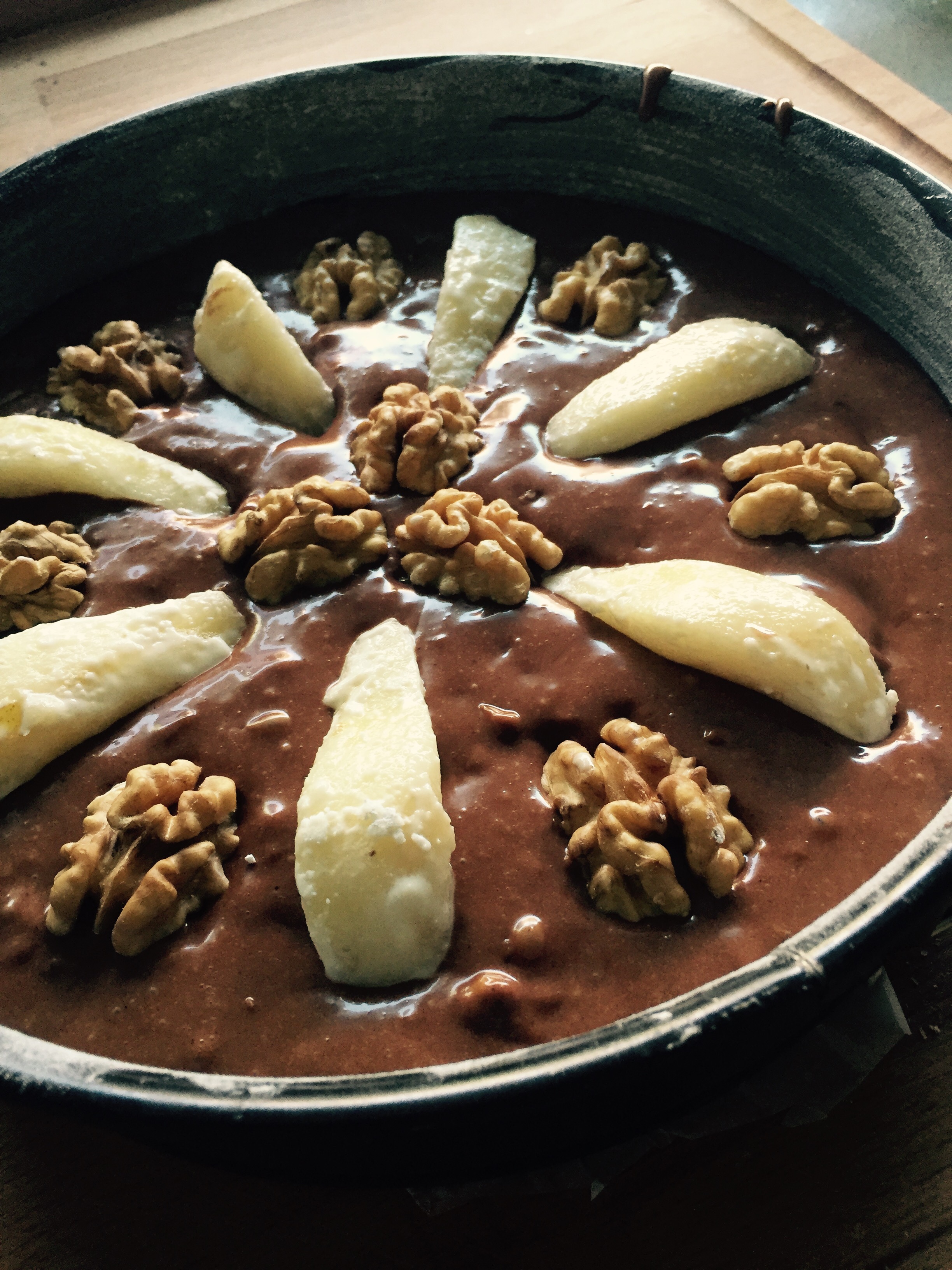 Mit den beiseite gelegten Birnen und eingen ganzen Nüssen dekorieren.