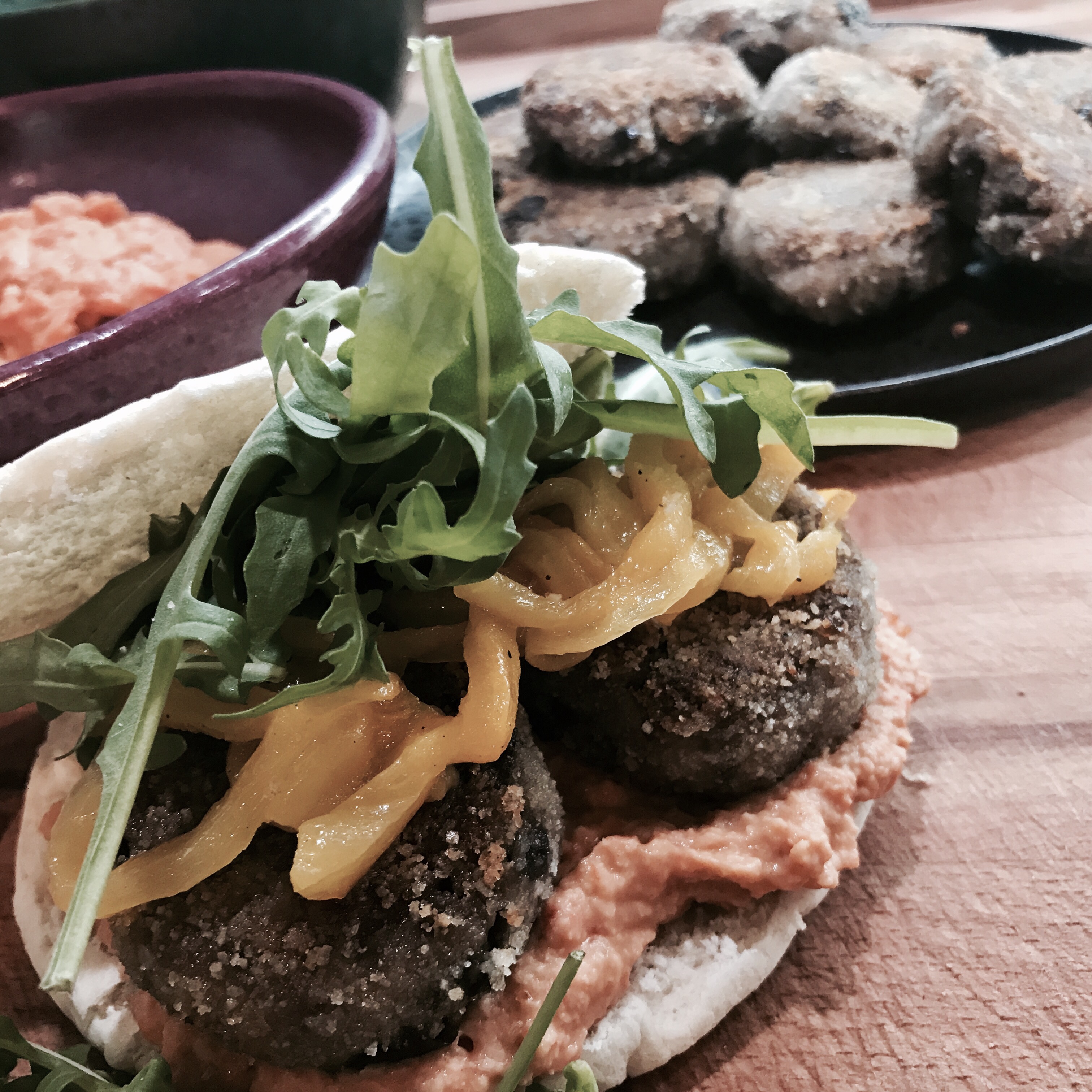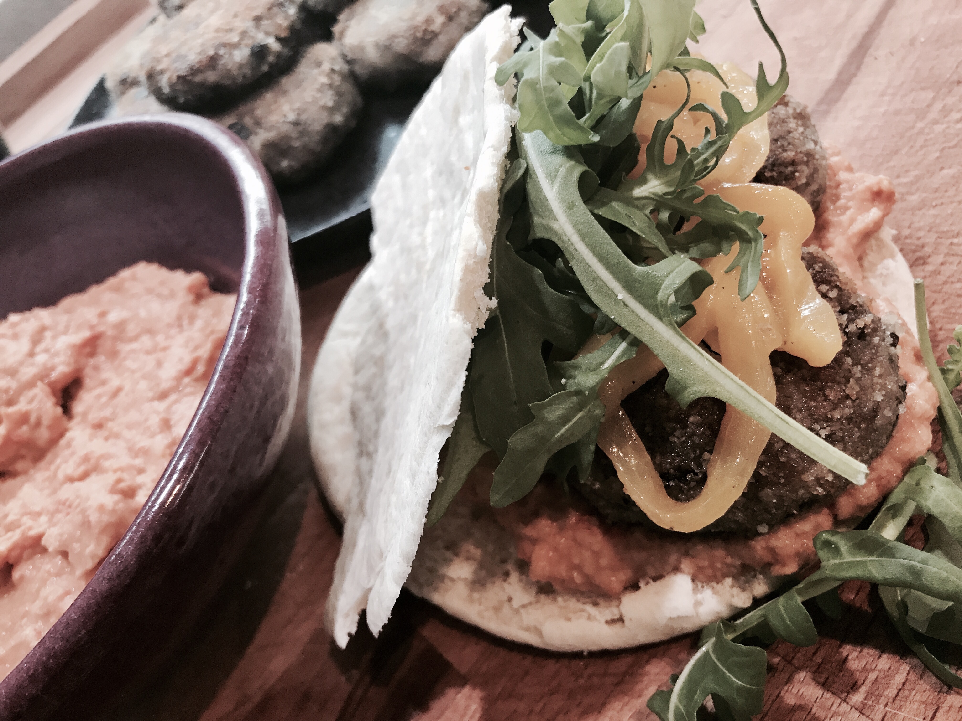 Die so vorbereiteten Burger in Olivenöl beidseitig goldbraun braten. Ich habe die Burger mit gegrillten Paprikas, Ruccola und Hummus (Rezept hier) serviert.