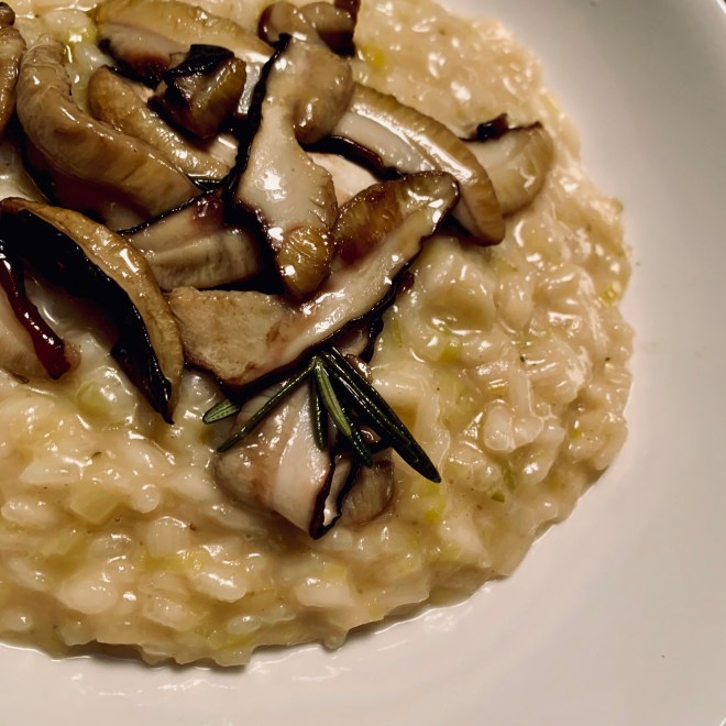 Den Riosotto gleich in den Teller verteilen und mit den Steinpilze garnieren.
