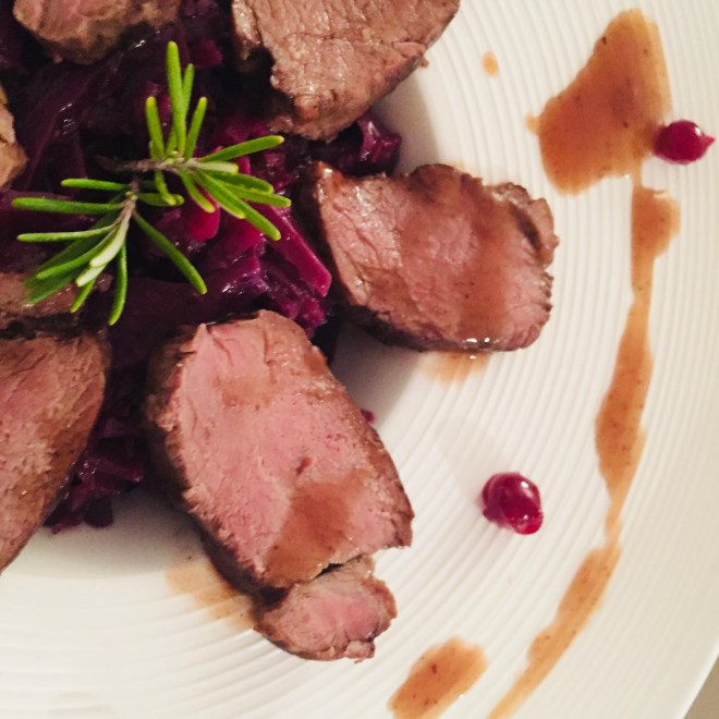 Den Rehrücken mit Salz und Pfeffer würzen und in etwas Olivenöl rundherum anbraten. Anschliessend die Pfanne im vorgeheizten Ofen bei 100 Grad ca. 50 Minuten rosa braten (bei Druck mit dem Zeigefinger gibt das Fleisch leicht nach).