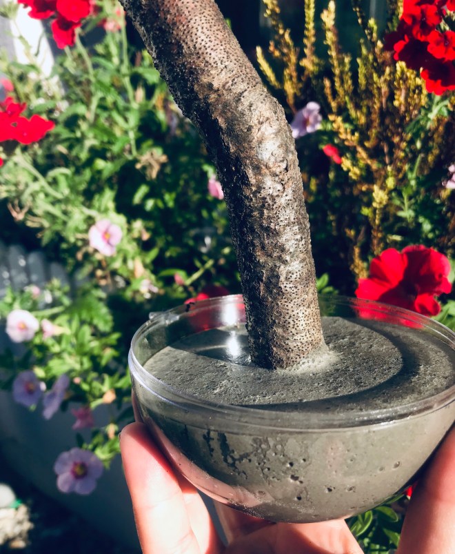 Den angerührten Beton nun in die Schalen geben und pro Schale einen Holzstab geben, der Beton zieht relative schnell (5-10 Minuten) an bis dahin sollte der Stab gestützt werden. Ich habe die Halbschalen an eine Wand gestellt und die Stäbe an die Wand angelehnt.