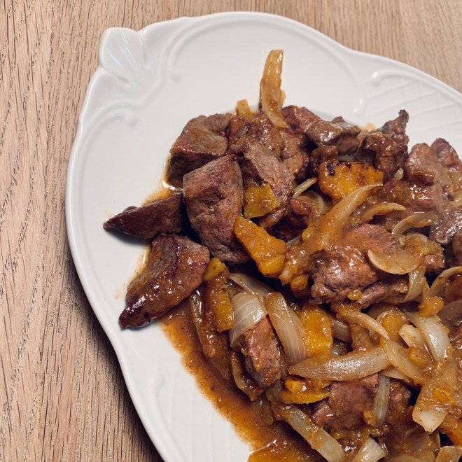 In der selben Pfanne der Leber die Zwiebel und den Butternusskürbis mit etwas Olivenöl so lange dünsten bis sie beide weich sind, eventuell etwas heisses Wasser dazugeben und verkochen lassen.