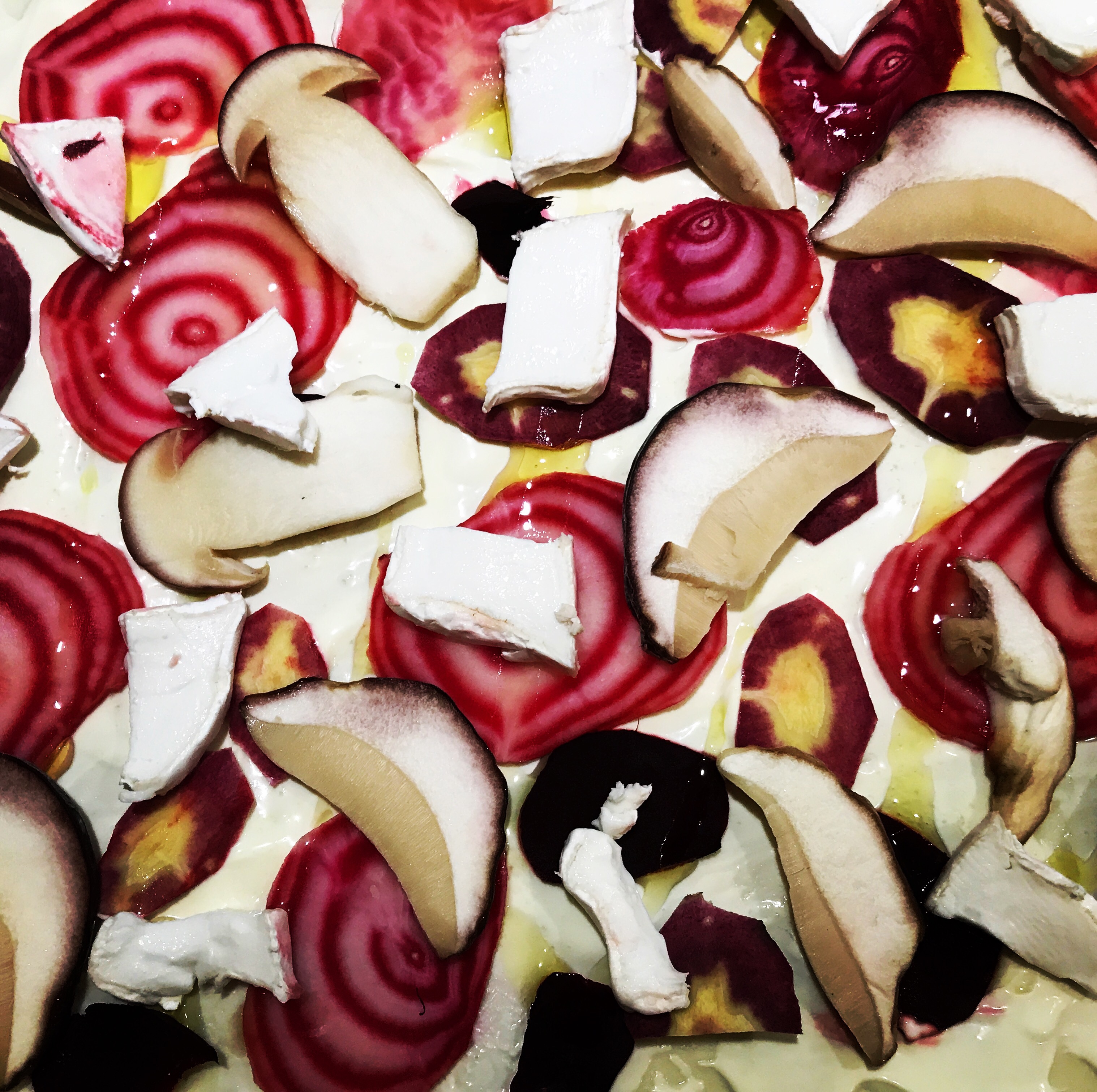 Das Wurzelgemüse schälen, in Scheiben schneiden und mit den Steinpilzen auf dem Teig verteilen.