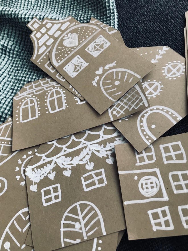 Auf das Tonpapier Hausumrisse skizzieren und ausschneiden. Mit dem weissem Stift die Häuser verzieren.