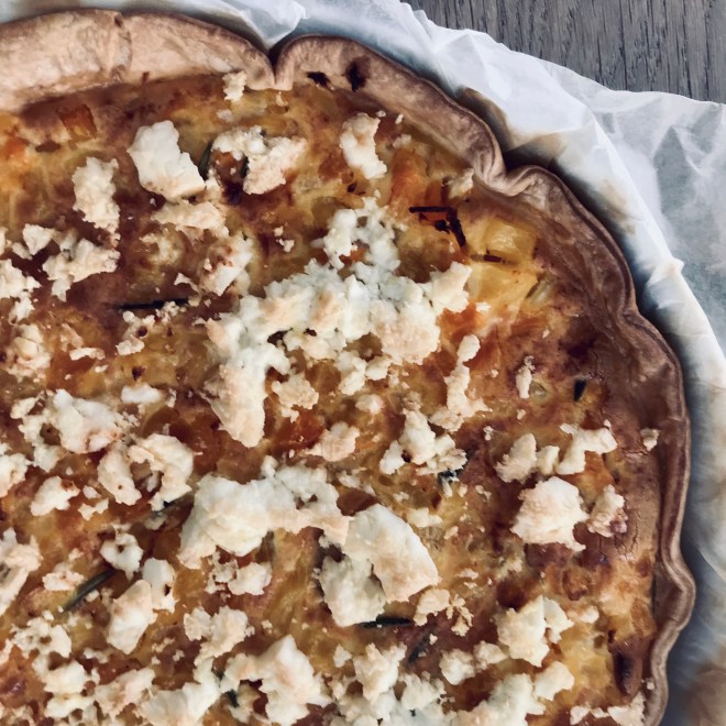 Den Kürbis in einer Pfanne salzen und mit dem Rosmarin in etwas Olivenöl weichdünsten. In der Zwischenzeit den Kuchenteig in einer Quicheform blind ca. 20 Minuten bei 180 Grad Umluft backen.