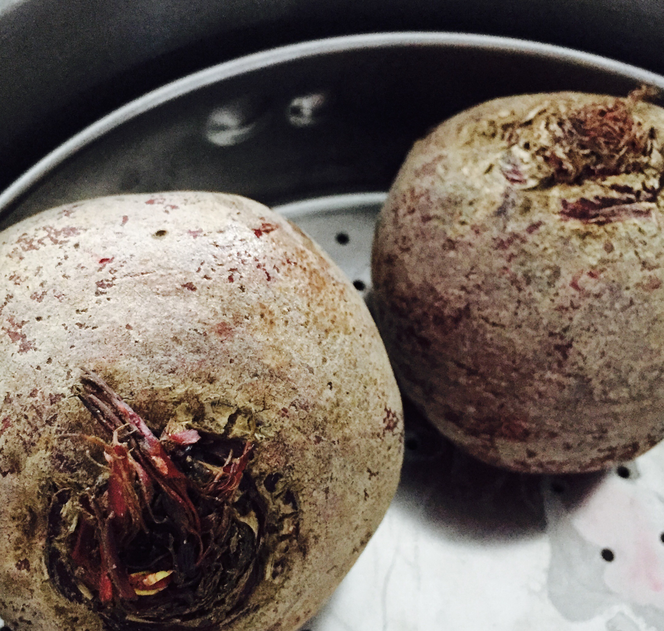 Die Rote Bete im Schnellkochtopf mit dem Dampfeinsatz 25 Minuten garen. Dafür das Rauchsalz in etwas Wasser (ca. 2 Fingerhoch) auflösen und die Thymianzweige dazugeben, Dampfeinsatz einsetzen und die Rote Beete draufgeben. Dadurch bekommt die rote Bete ein feines rauchiges Aroma.