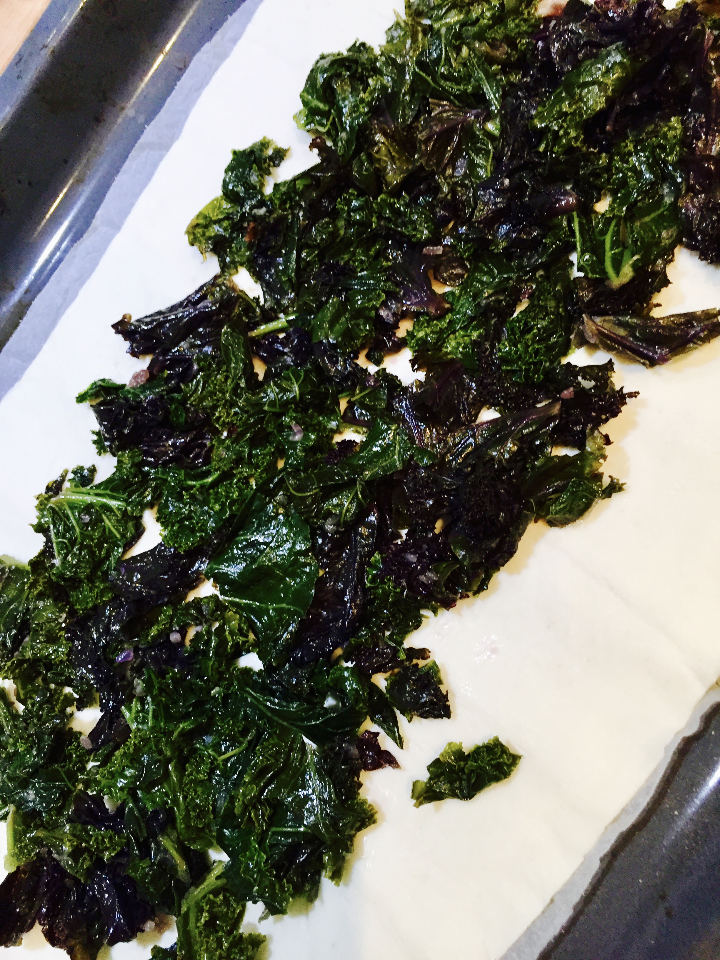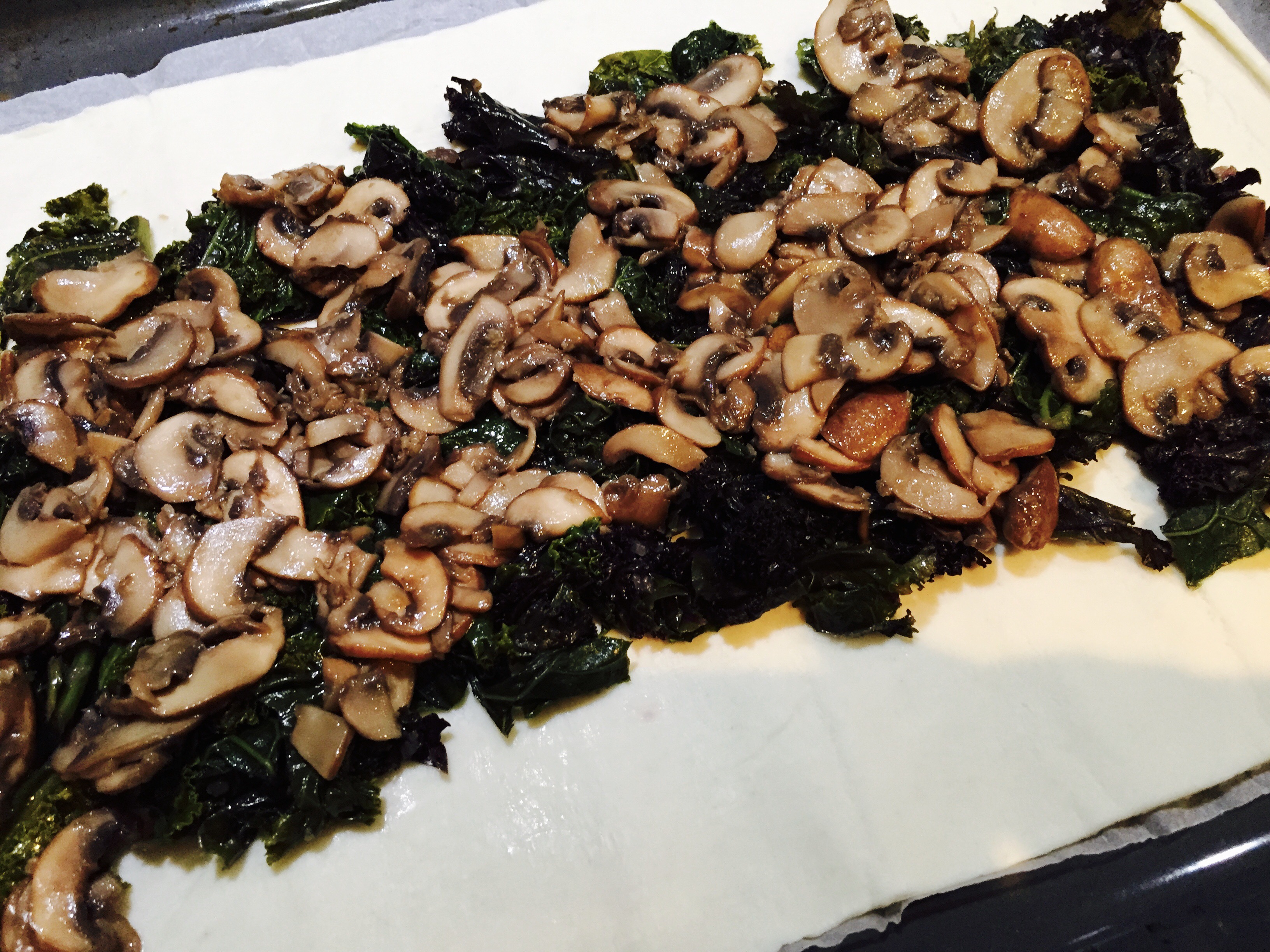 Den Blätterteig ausrollen, das Toastbrot darauf verteilen und darauf den Federkohl, anschliessend die Pilze.