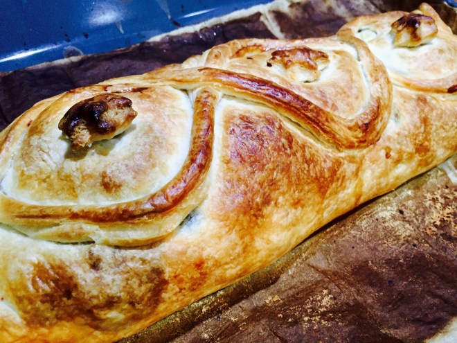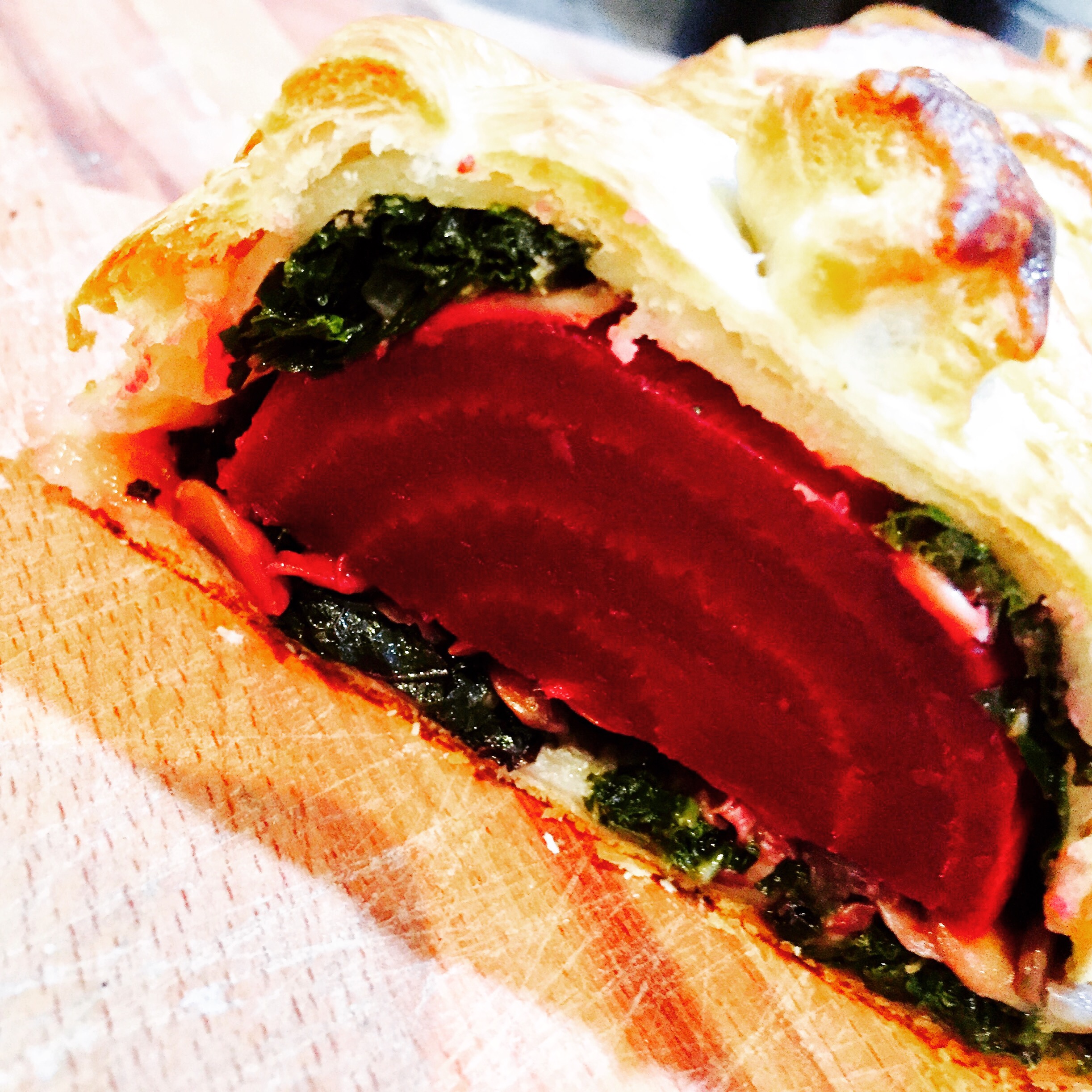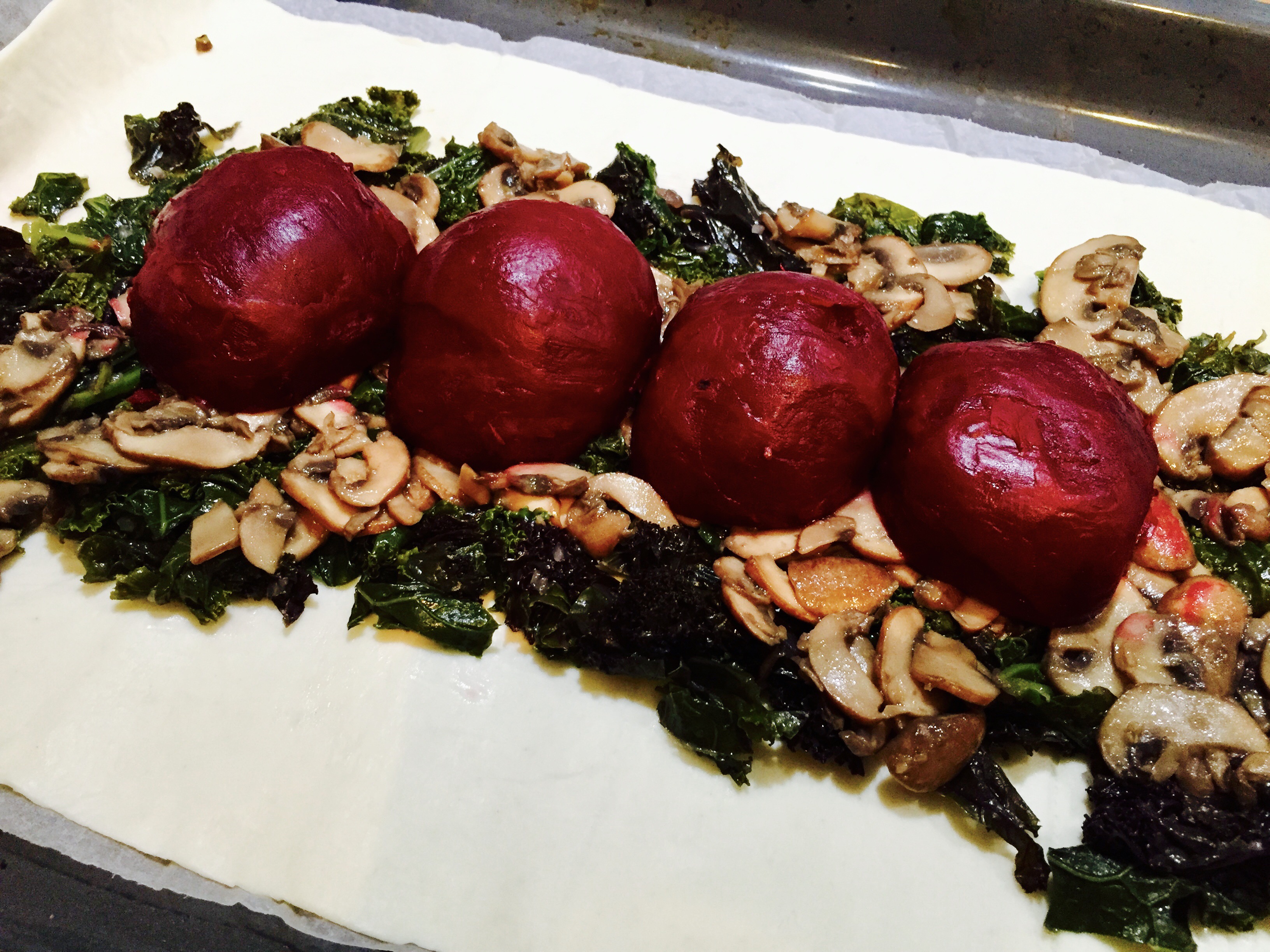 Die Rote Bete halbieren und auf die Pilze legen. Das ganze mit dem Blätterteig einschlagen und auf Wunsch verzieren.