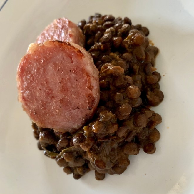 Hier also das in Italien mit Abstand am meist gekochte Gericht an Silvester :Linsen mit Cotechino, eine kräftig gewürzte grobe Wurst aus Schweinefleisch.