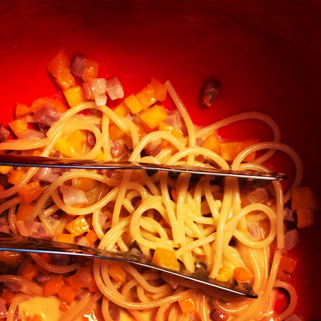 Sobald die Spaghetti gar sind diese abseihen und noch tropfnass zu den Speck-Kürbiswürfel geben. Die Eiercreme dazugiessen und gut schwenken.