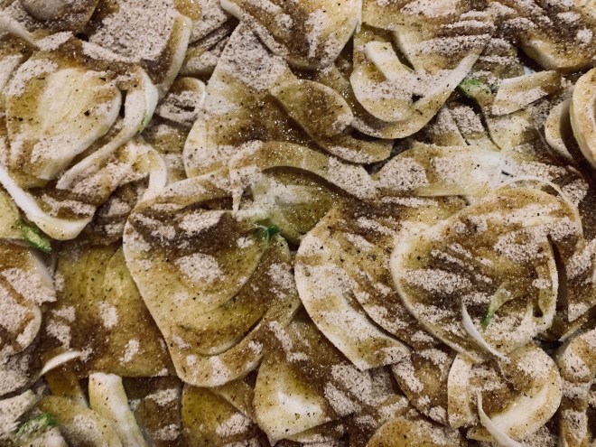Den Fenchel mit der Gewürzmischung grosszügig bestreuen und mit Olivenöl beträufeln.