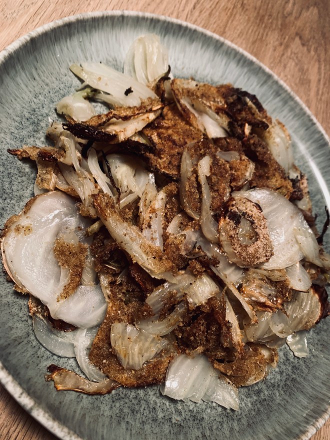 Im Ofen bei 180 Grad Umluft solange garen bis der Fenchel weich und die Panade leicht knusprig. Bei Bedarf etwas nachsalzen.