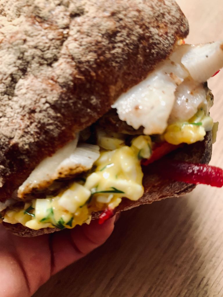 Anschliessend den Burger mit je einer Schicht Fisch, Randensalat und Eiersauce zusammensetzen.