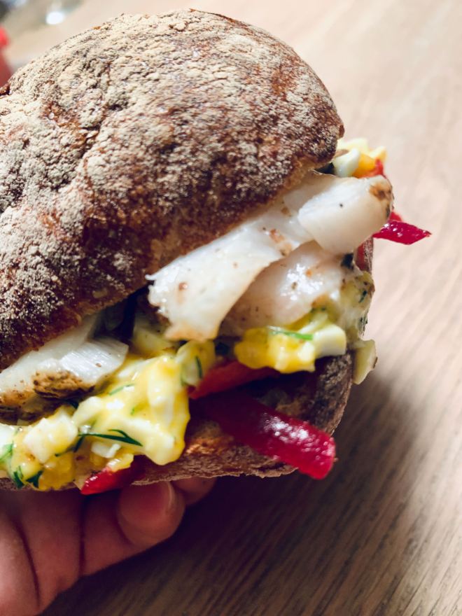 Anschliessend den Burger mit je einer Schicht Fisch, Randensalat und Eiersauce zusammensetzen.