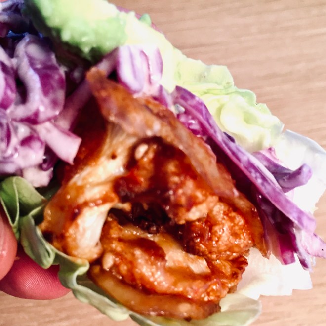 Nun können die Lattichblätter mit den marinierten Blumenkohl und dem Rotkohlsalat gefüllt werden.