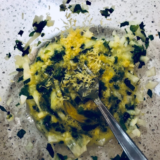 In der Zwischenzeit die Zwiebel und die Minzblätter sehr fein hacken und mit den ausgedrückten Zucchiniraspel, dem Ei, dem zerbröselten Feta und 1 Teelöffel Zitronenabrieb vermischen.