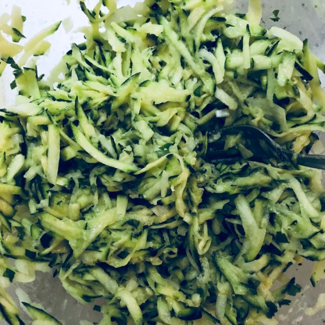 Als erstes die Zucchinis über eine grobbe Raffel raspeln, leicht salzen und in einem Sieb abtropen lassen.