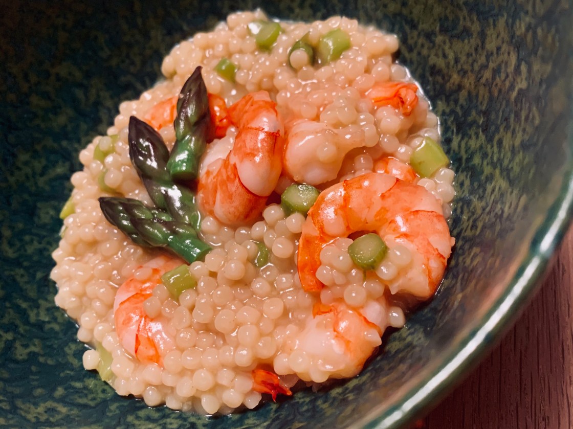 Den Wein einkochen lassen und mit dem Spargelfond wie bei einem Risotto so lange aufgiessen bis der Couscous bissfest ist. Zum Schluss die Garnelen zum Couscous geben um sie nochmals kurz zu erwärmen.
