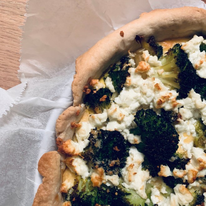 Sobald der Boden bereit ist und der Brokkoli bissfest, den Brokkoli auf dem Teig verteilen und das Ei-Käsegemisch dazugiessen.