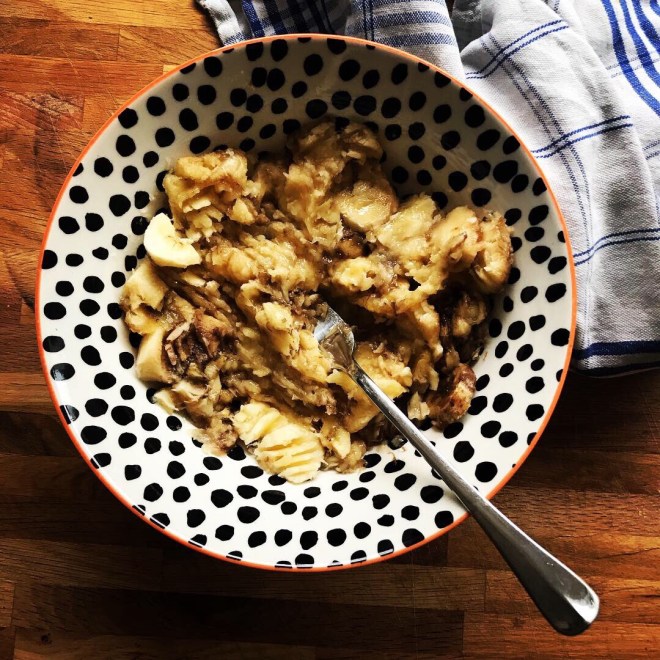 Die Butter und den Zucker schaumig aufschlagen, die Eier dazugeben sowie die zerdrückten Bananen.
