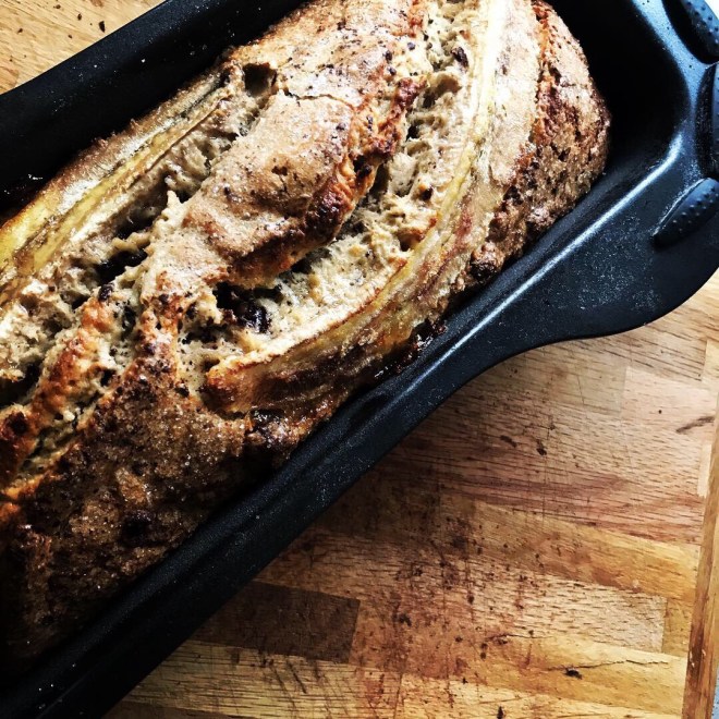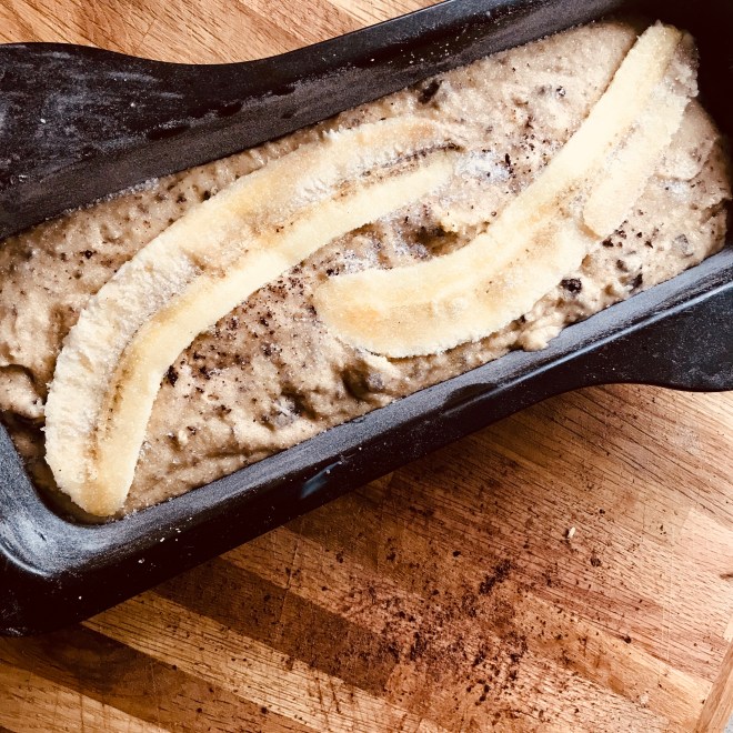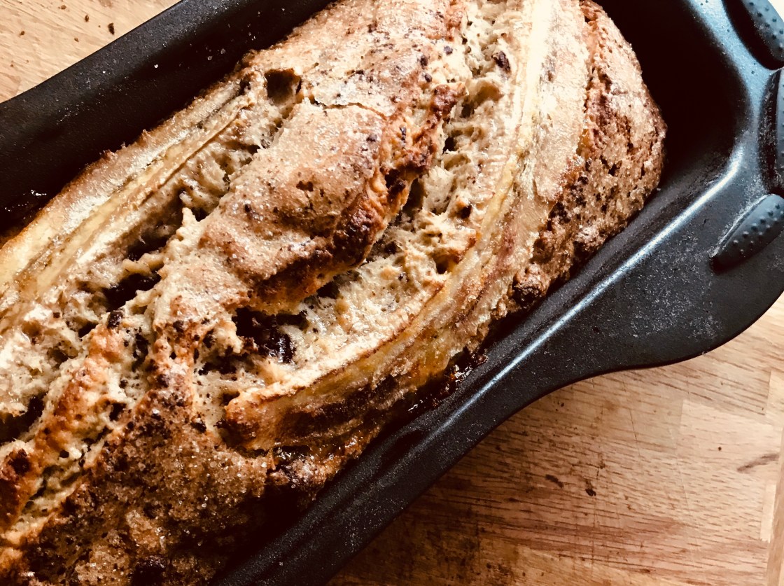 Den Ofen auf 180 Grad Umluft vorwärmen und das Bananenbrot ca. 40 Minuten backen.
