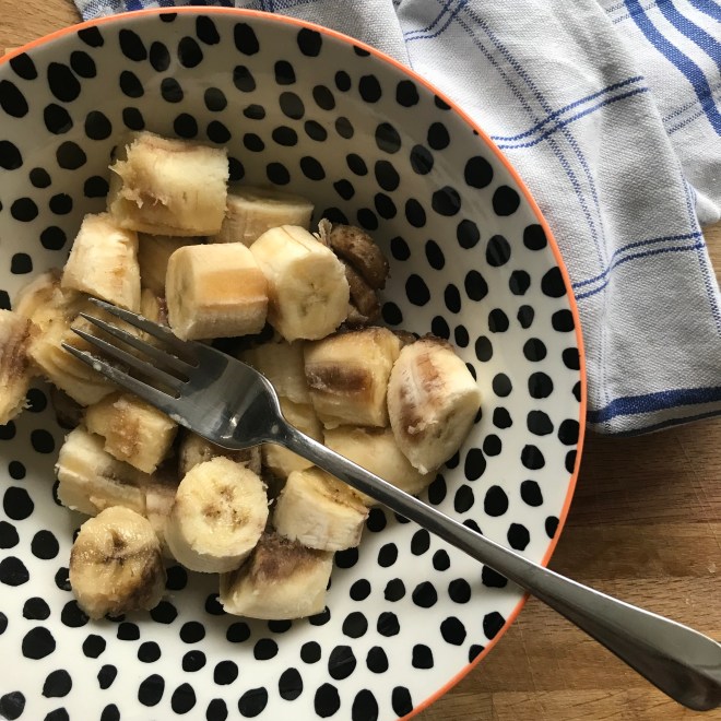 Eine Kastenform buttern und mit Mehl bestäuben bevor der Teig darin verteilt wird. Die letzte Banane halbieren und auf den Teig legen, anschliessend mit etwas Rohrzucker bestreuen.