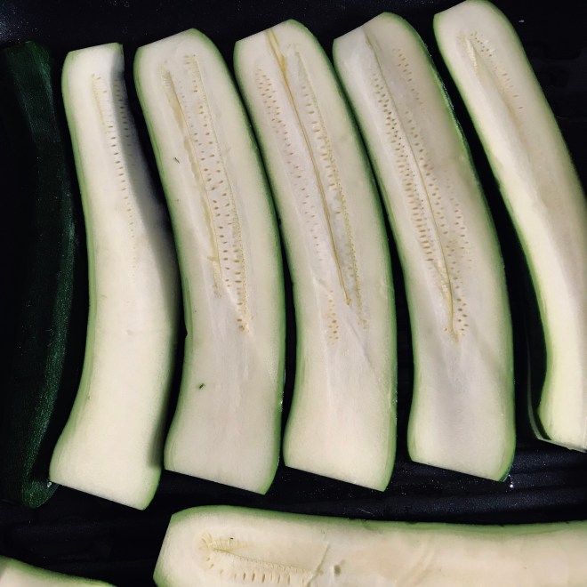 In der Zwischenzeit die Zucchinischeiben in einer Grillpfanne grillen.
