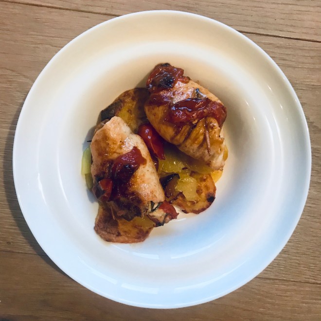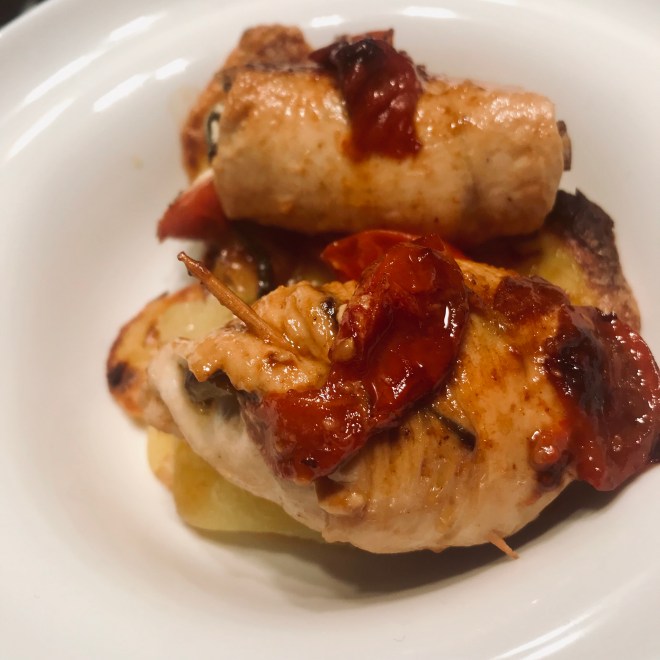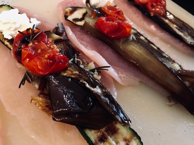 Die Hühnerscheiben salzen und mit je einer Zucchinischeibe, einer Auberginehälfte einigen geschmorten Tomaten und eine Teelöffel Robiola belegen und anschliessend einrollen. Mit einem Zahnstocher die Röllchen feststecken und in etwas Olivenöl rundherum goldbraun braten.