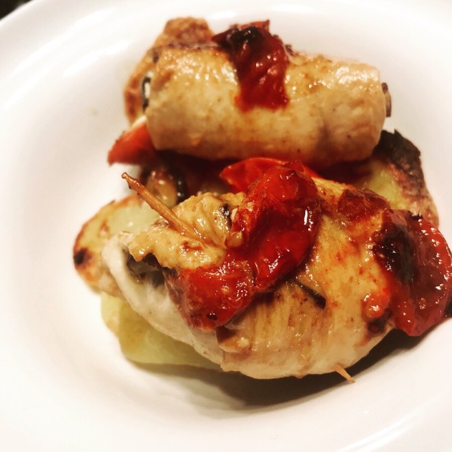 Die Hühnerscheiben salzen und mit je einer Zucchinischeibe, einer Auberginehälfte einigen geschmorten Tomaten und eine Teelöffel Robiola belegen und anschliessend einrollen. Mit einem Zahnstocher die Röllchen feststecken und in etwas Olivenöl rundherum goldbraun braten.