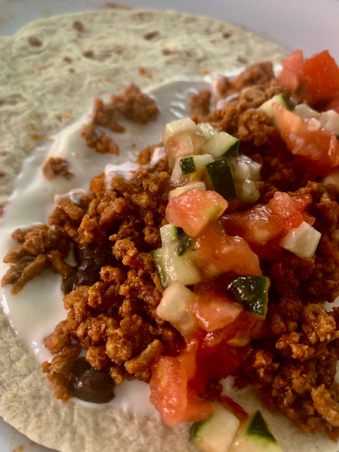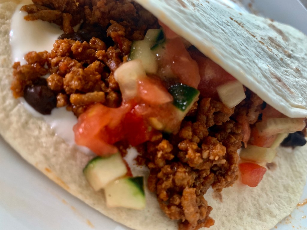 Die Weizentacos mit dem Hackfleisch, den Bohnen und der Salsa füllen und je nach Geschmack mit Käse bestreuen.