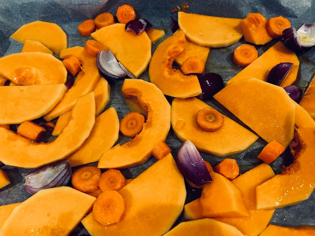Den Butternusskürbis und die Karotten schälen und in feine Scheiben schneiden. Zusammen mit den geschälten und geviertelten Zwiebeln auf ein mit Backpapier ausgelegtes Backblech geben.