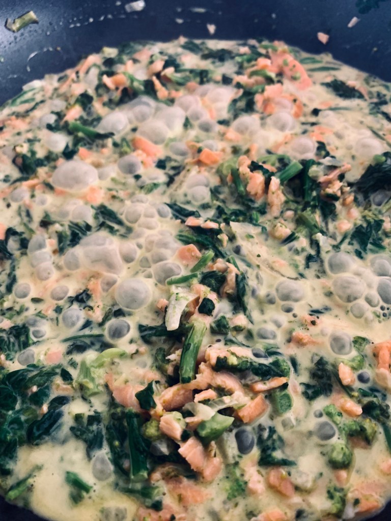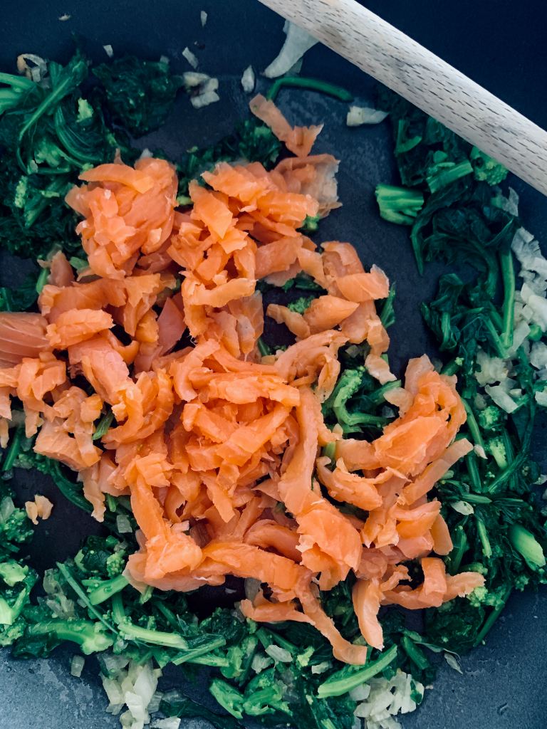 Die Cime di rapa waschen und in reichlich kochendem Wasser kurz blanchieren. Nun abseihen und gemeinsam mit der Zwiebel klein schneiden. Das Gemüse anschliessend in einer grossen Pfanne mit etwas Olivenöl und Salz weichdünsten. Nach diesem Schritt den klein gewürfelten Rauchlachs zum Gemüse geben und mit dem Orangensaft und der Sahne ca. 10 Minuten eindicken lassen.