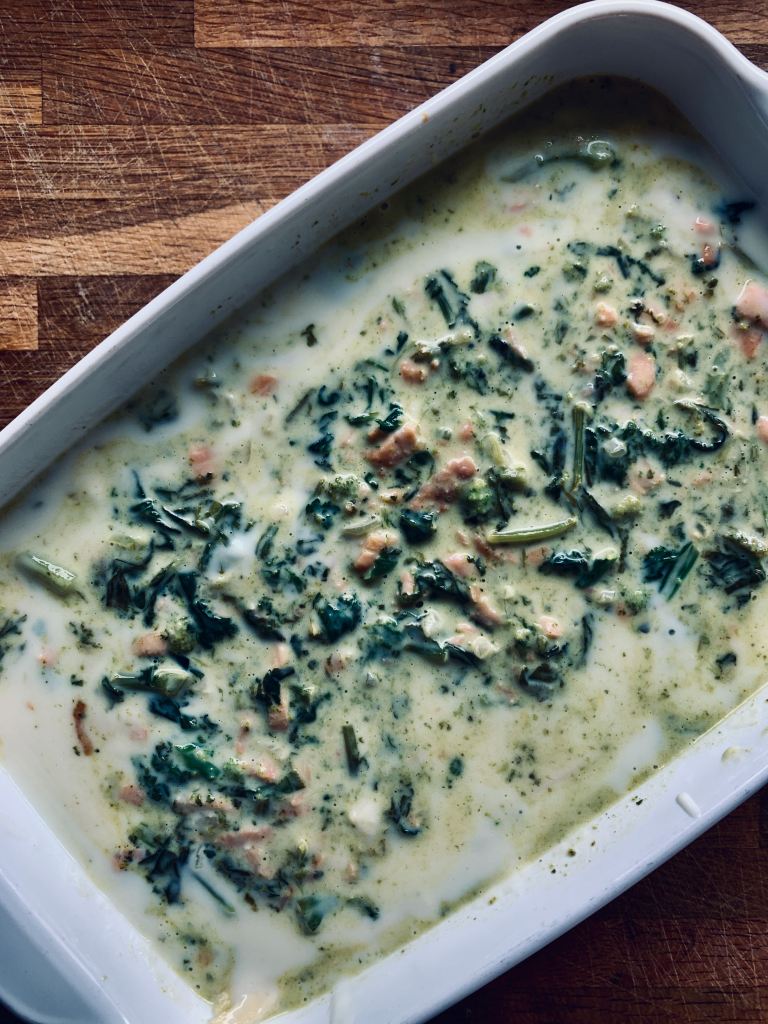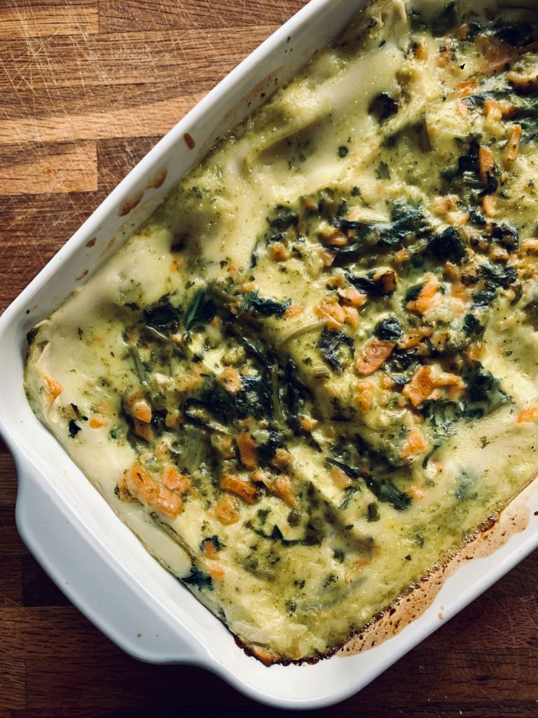 In der Zwischenzeit die Bechamelsauce vorbereiten. Anschliessend die Lasagne zusammensetzen: mit einer Schicht Gemüse/Rauchlachssauce beginnen, mit einer Lage Bechamelsauce weiterfahren und mit den Lasagneblättern abdecken. So fortfahren bis alle Saucen aufgebraucht sind. Die letzte Schicht sollte eine Lage Gemüsesauce sein.