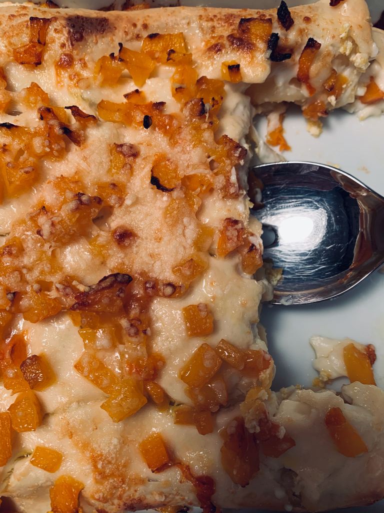 Die Füllung in einen Spritzbeutel mit grosser Tülle füllen und damit die Canneloni füllen. Die Cannelloni anschliessend in eine ofenfeste Form geben und mit der Besciamelsauce bedecken und mit den restlichen 2 Esslöffeln Parmigiano und den Kürbiswürfeln bestreuen.