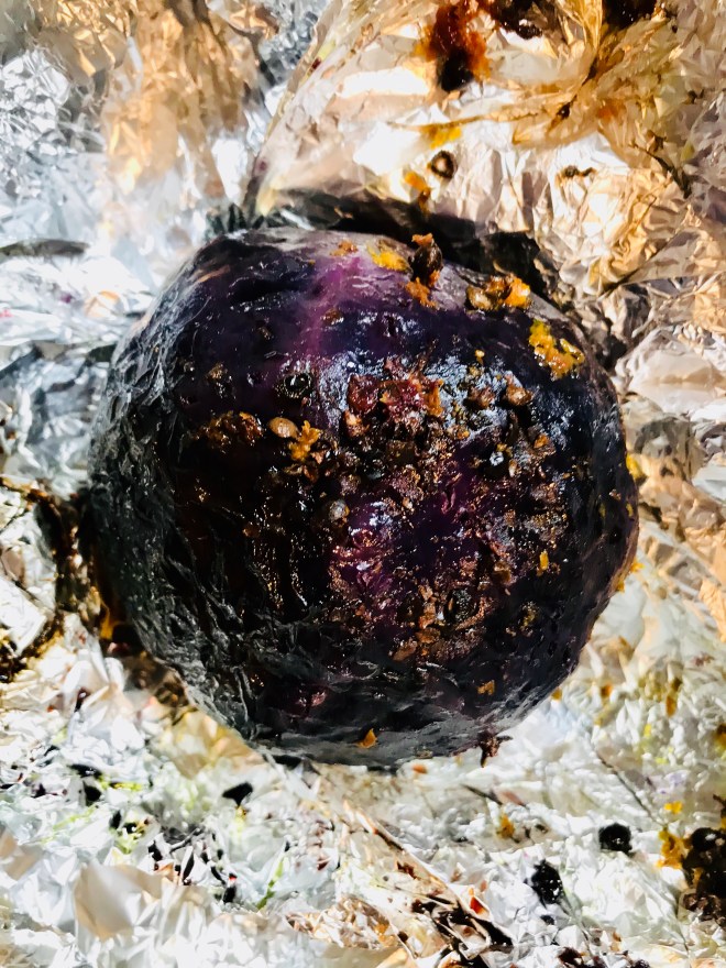 Anschliessend für den Rothkohl die Pigmentkörner und Wacholderbeeren etwas mörsern oder mit einem breitem Messer zerdrücken. Anschliessend den Rotkohl auf ein Stück Aluminiumpapier setzen und mit den Gewürzen bestreuen, die Nelken und das Lorbeerblatt dazugeben, salzen mit Olivenöl betreufeln, und zum Schluss etwas Orangenabrieb dazugeben.