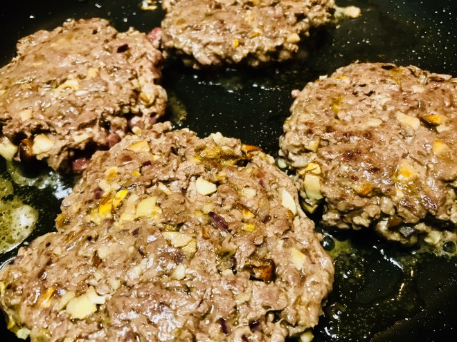 Aus dieser Masse die Patties formen und beidseitig in etwas Olivenöl braten. Kurz vor dem Schluss eine Scheibe Gorgonzola auf die Patties geben und schmelzen lassen.