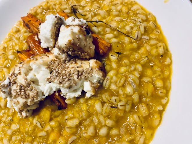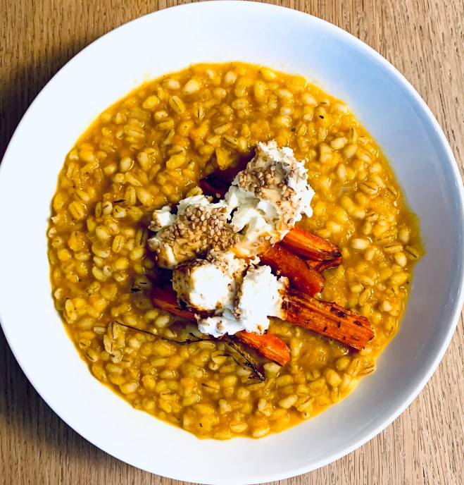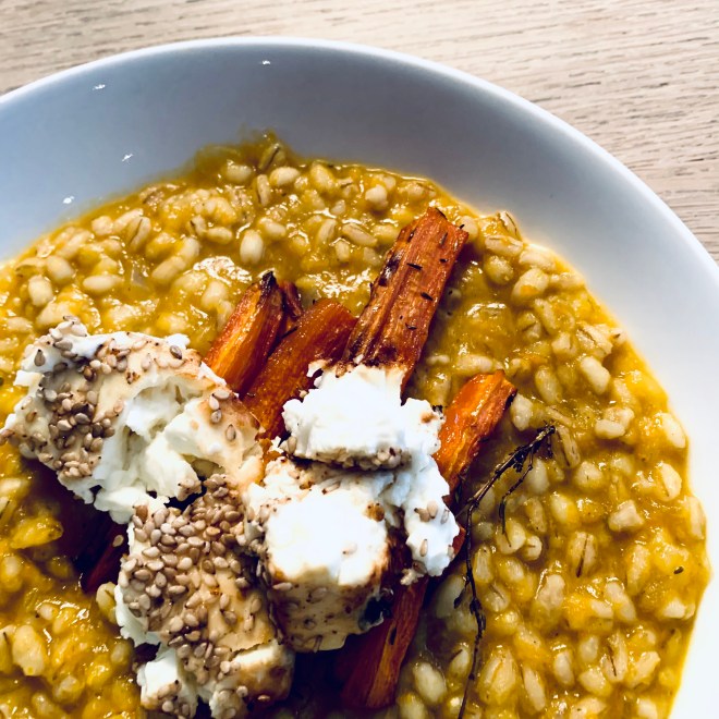 Den Gerstenrisotto schön heiss in den Tellern anrichten und mit den gerösteten Karotten und dem zerbröselten Feta verfeinern.