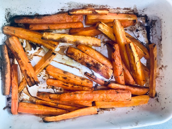 Die Karotten schälen und in ca. 10 cm lange Stifte schneiden. Die Karotten in eine Ofenform geben und mit ein Teelöffel Dattelsirup, etwas Olivenöl, Salz und den Thymianzeiglein marinieren und bei 22o Grad Umluft goldbraun rösten. Sobald die Karotten weich sind die Hälfte davon mit 2 Suppenkellen heisser Brühe fein pürieren.