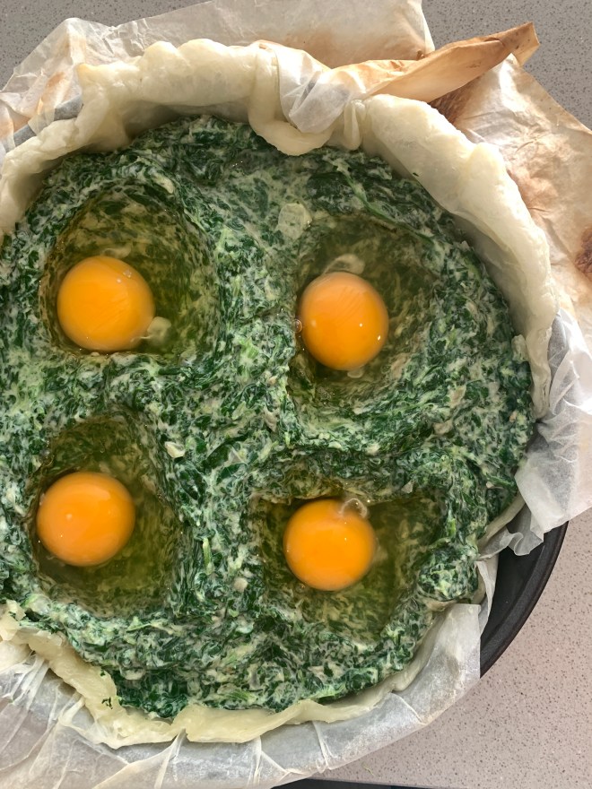 Mit einem Löffel 4 Mulden in die Farce drücken und mit je ein Ei füllen. Mit der zweiten Blätterteigrolle abdecken und dabei die Ränder gut schliessen. Mit einem Messer einige kleine Löcher in den Blätterteig machen und bei 200 Grad ca. 30-40 Minuten backen bis die Quiche golbraun ist.