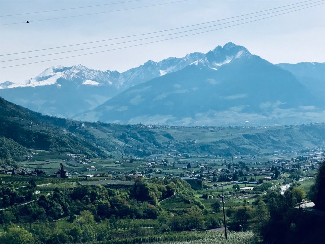 Von den blühenden Wiesen aus begleitet uns ein wunderbarer Blick über Meran und Tirol, das mit seinem Schloss auf Meran schaut umrahmt von den mit Schnee bedeckten Bergspitzen.