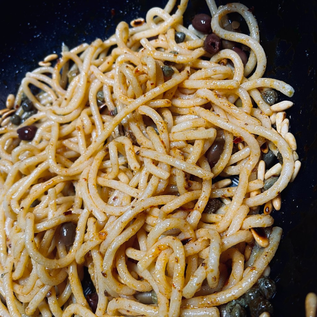 Die Spaghettoni abseihen und zu der ‘Nduja geben, ebenso die Oliven, Kapern und die gerösteten Pinienkerne und alles mit einer halben Tasse Kochwasser gut schwenken.