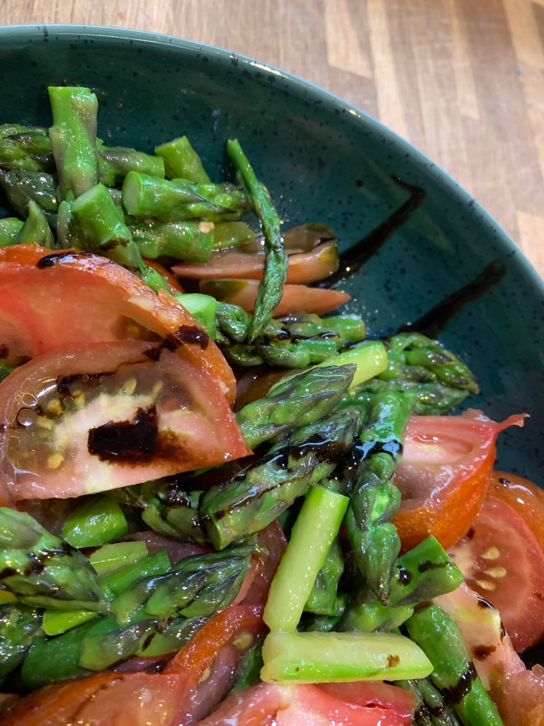 In der Zwischenzeit die Tomaten waschen und vierteln. In einer Salatbowl die Tomaten und die in kleine Stücke geschnittenen Spargeln vermischen und mit Olivenöl, Salz und Aceto Balsamico Creme abschmecken.