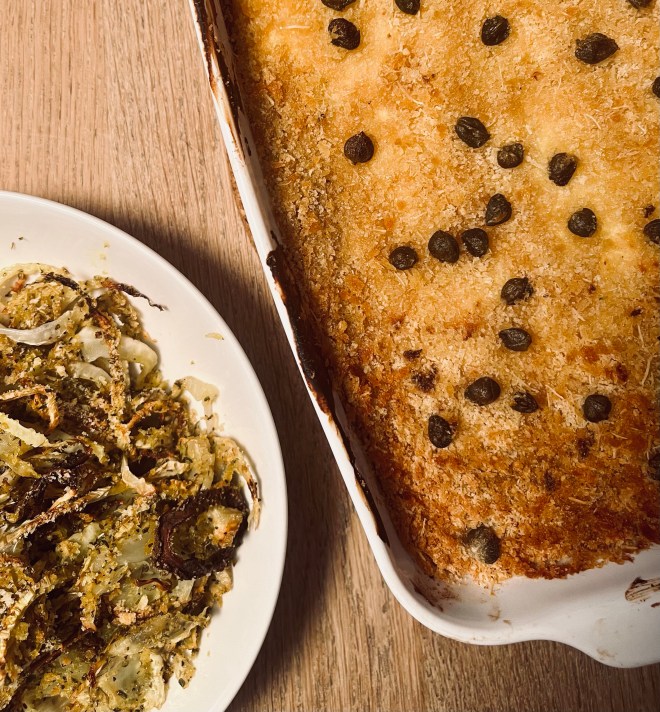 Nun das Panko- und Paniermehl mit den weiteren 2 Esslöffeln Parmigiano und den Kapern vermischen und anschliessend auf die Ricottamischung verteilen.