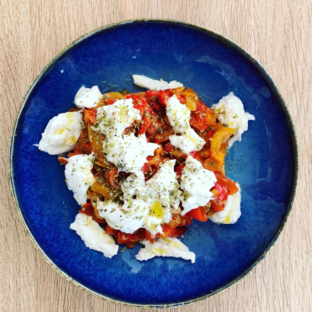 In der Zwischenzeit die Friselle mit einem halben Glas Wasser einweichen. Anschliessend auf ein Teller geben und mit dem Gemüseragout und der Burrata belegen.