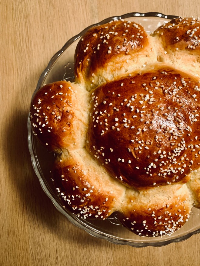 Anschliessend den Königskuchen formen. Dafür eine grosse Kugel und 6 gleichgrosse kleinere Kugeln formen, in einer der Kugeln eine ganze Mandel verstecken. Wer die Mandel findet ist König. Die kleinen Kugeln nun um die grosse legen und nochmals 15 Minuten ruhen lassen. Bevor der Kuchen in den Ofen geht das Eigelb mit dem Esslöffel Milch verquirlen und den Kuchen damit bestreichen. Den Hagelzucker auf dem Kuchen verteilen und nun im vorgewärmten Ofen bei 180 Grad den Königskuchen 30 Minuten backen.
