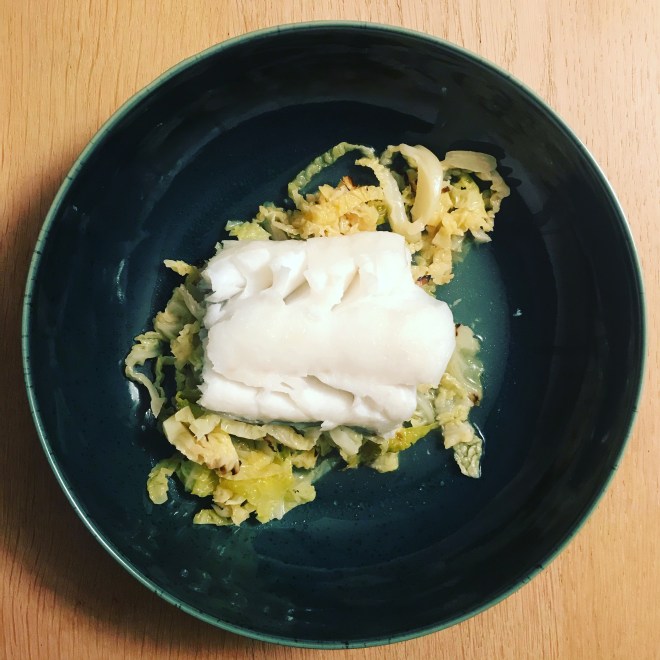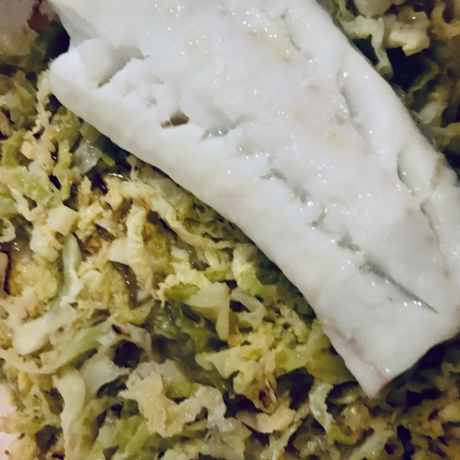 Der Fisch ist gar wenn er noch leicht glasig ist. Nun den Fisch und den Wirsing aus dem Topf entfernen und den Kochsud leicht einkochen und mit etwas kalter Butter zu einer sämigen Sauce binden.